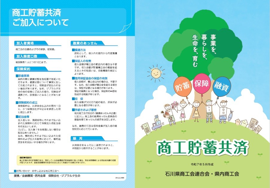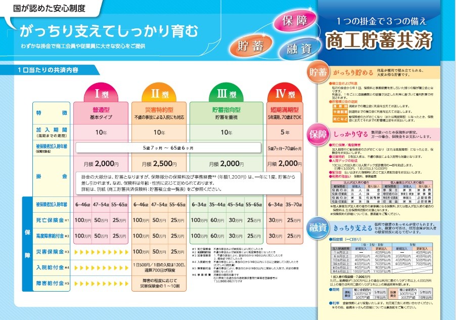 商工貯蓄共済は、1つの掛金で、「貯蓄」「保障」「融資」の3つを備えた、商工会員のための共済です。